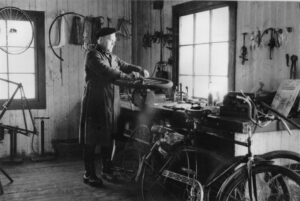 Arvo verstaassaan. Kuvan oikealla puolella näkyy Arvon oma polkupyörä, johon oli asennettu moottori apuvoimaksi. Museolle kuvan lahjoitti Ritva Vuori.