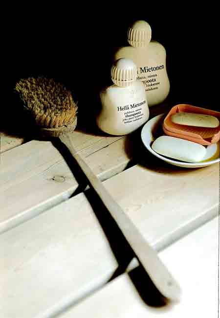 - Saunatarvikkeita: harja, saippua ja Hellä Mietonen (Kuva Sanna Liimatainen)